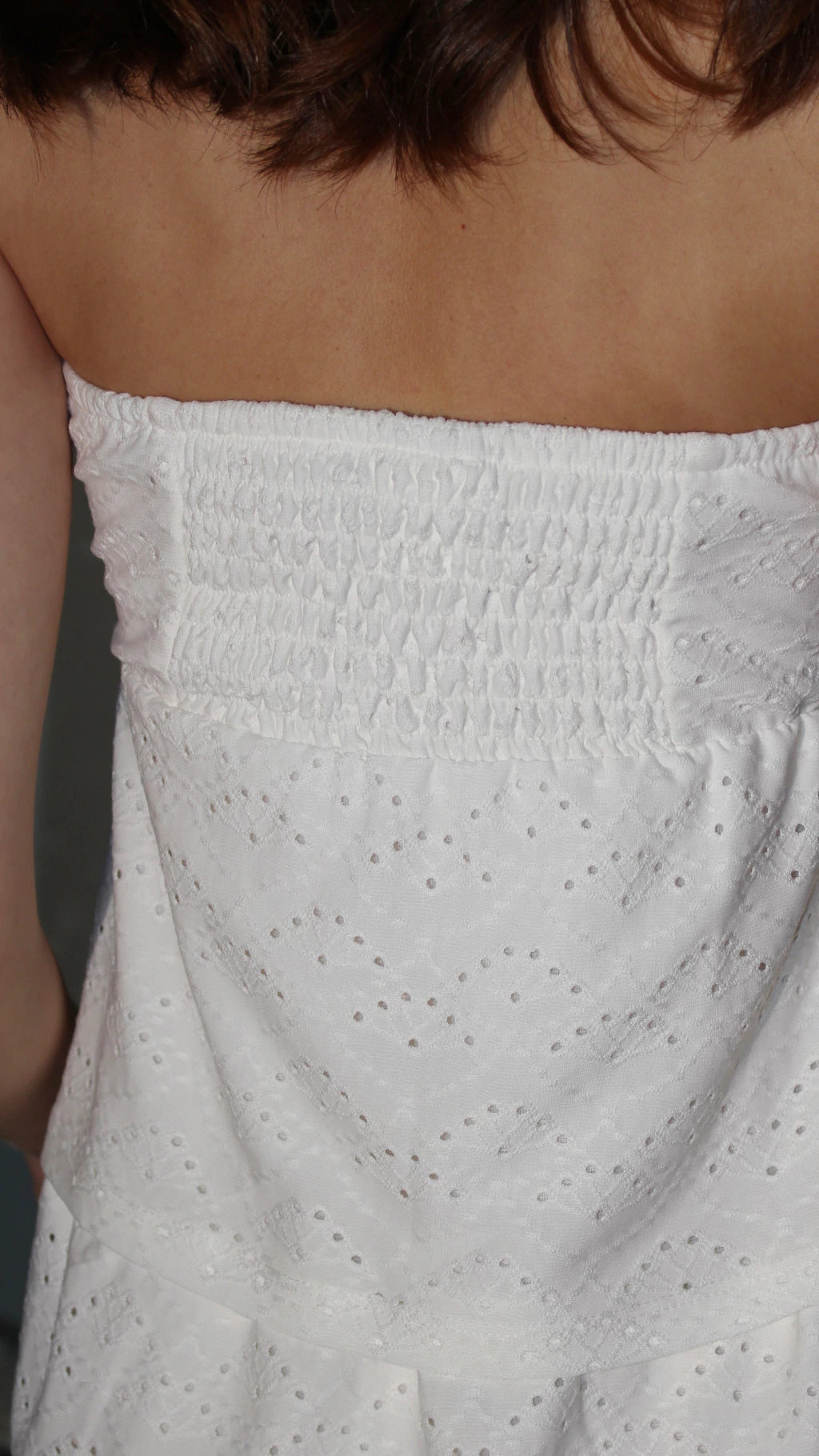 Vestido curto em malha laise bordada, com caimento leve e camadas de babados que criam movimento natural. A peça possui amarração regulável no decote, que permite ajuste do busto e garante melhor sustentação. Conta ainda com forro interno e lastex nas costas para conforto e acabamento impecável. Feminino, fresco e perfeito para dias solares.